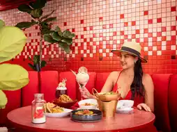 🍟 Under The Sun, a red beach bar with a modern theme throughout the shop. There are food, desserts, snacks, and drinks. Come sit and enjoy the breeze, listen to chill music by the sea from noon until evening.