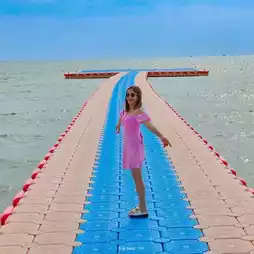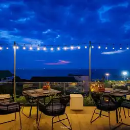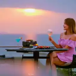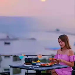 Near the swimming pool, walk up the stairs and you will find the Sky Vibe Rooftop Bar. You can see the beautiful view from this angle. In the evening, Wan ate here. There was a barbecue and cold drinks. We ate and watched the sunset. The atmosphere was great.