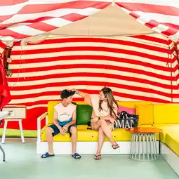 Lie on a rubber ring and surf in the artificial sea. Watch movies on a giant screen in the middle of the sea with a great sound system like being in an outdoor cinema.