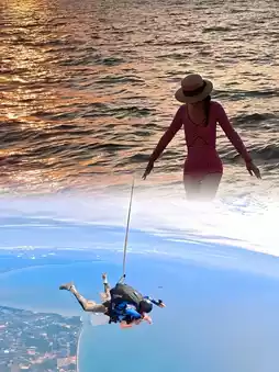 With the instructor's command, we were slowly lifted off the ground. At that moment, my heart raced, and a mix of nervousness and excitement filled me. As we gained altitude, the ground below gradually shrank, replaced by a broader view. I looked down at the beach below, feeling the cool sea breeze gently brushing my cheeks, as if the whole world had come to a standstill at that moment.
