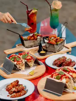 It is a reggae-style bar right by the sea. The atmosphere is very good. There are snacks such as fried chicken, French fries, and drinks, cocktails, mocktails, and more. It is suitable for chilling with friends and enjoying the beautiful sea view.