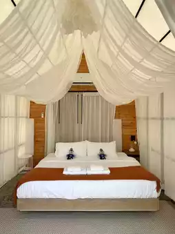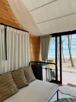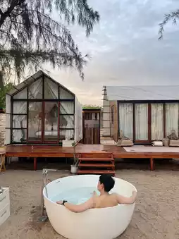 Today, we come to a beach house with a panoramic view at EOD Beach at Mollusc Glamping. It is a twin house where one house is a bedroom and the other house is a living room. Enjoy the sea breeze.
