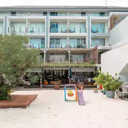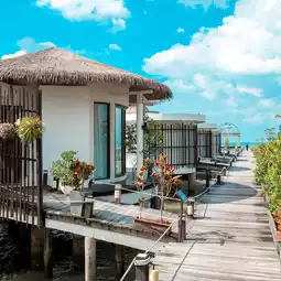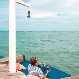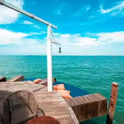 A seaside accommodation with a nice atmosphere. There is a cafe in the middle of the sea.