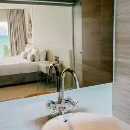 Worita Cove Hotel, a minimalist hotel by the sea with a super cute price, lots of beautiful photo spots, a see-through swimming pool for taking pictures, and a slide to play on. There are both restaurants downstairs by the sea and a rooftop bar upstairs with a great view from both restaurants. If you're looking for a good place to stay at a great price, this is the place for you. 💙💙💙