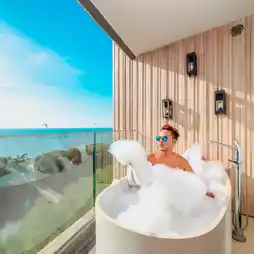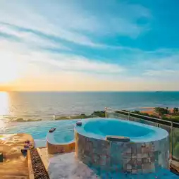 We recommend the Executive Ocean View room, which comes fully equipped with modern amenities and features a private balcony with a bathtub. Guests can soak in the tub while enjoying stunning elevated views of the ocean.