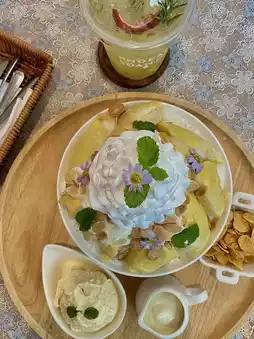 The atmosphere of this shop is very good. There is both a chill-out area in the garden and a fruit garden where you can walk and take pictures. On Saturdays and Sundays, they have a special menu, "Durian Bingsu", using fresh durian, fragrant, creamy, and just the right amount of sweetness. Served with custard ice cream And condensed milk is so good 🍧🥭 For those who love nature + love sweets, you should come here.