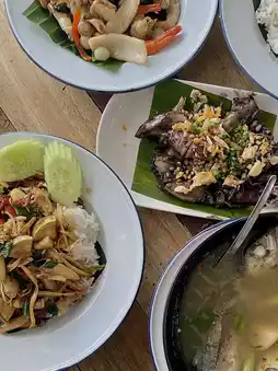 Yes… you read that right. This restaurant is actually located in a garage, but it’s really great. The seafood is super fresh and the prices are lovely. Recommended menus: Fried squid with garlic, seafood curry fried rice, stir-fried shrimp with holy basil, spicy fish soup. It’s as full as if you’re eating at a fresh market. Every menu is delicious and very cheap! The atmosphere is local and homey, but it has its own charm. 🐙🦐