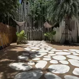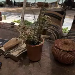 Decorated with bamboo, pastel-colored fabrics and trees, giving a natural boho feel, many beautiful photo spots