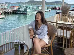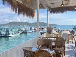 This beautiful cafe is located on the second floor of a two-story building. The design is beautifully done, with a color scheme that complements the sea. There's both an air-conditioned area and an outdoor area, making it a lovely spot to take photos from any angle. A must-visit!
