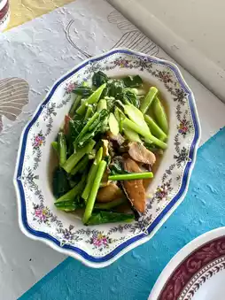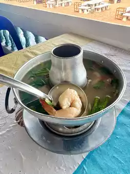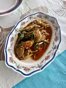✅ Review of our food today • Clear Tom Yum Goong soup: The Tom Yum soup is rich and flavorful. Just the right amount of spicy, tangy, and fresh, large, bouncy shrimp. • Stir-fried cockles with chili paste: Large, fresh, sweet cockles in a rich chili paste. • Sun-dried squid (this one was a bit tough for me). • Fried mantis shrimp with garlic, pre-cut and easy to eat, fragrant with garlic and fresh mantis shrimp. • Kale with salted fish: Delicious, crispy, and cooked kale, with chunks of salted fish.