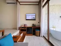 The common areas here include a beachfront infinity pool with panoramic sea views. There's also a fully equipped fitness center for those who enjoy a good workout. There's also a lounge area by the beach, creating a very chill and peaceful atmosphere.