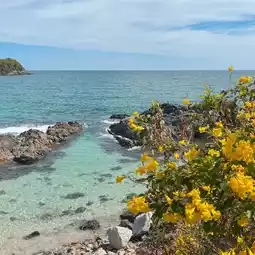 The atmosphere is wonderful, with pink tones contrasting with the sea. It's a great place to take photos. The balcony is adorned with bright yellow golden shower trees. 🌼🌿