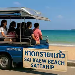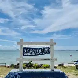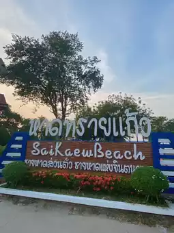 🌴✨ Sai Kaew Beach, Sattahip: A blissful day in Chonburi, filled with the vibrant colors of nature and the simplicity of local life. Start by riding a classic songthaew (minibus) from in front of the military base to Sai Kaew Beach. The roadside scenery is lined with lush greenery and a gentle sea breeze. Upon reaching the beach, stop and take a photo with the popular landmark sign "Sai Kaew Beach, Sattahip." 📸
