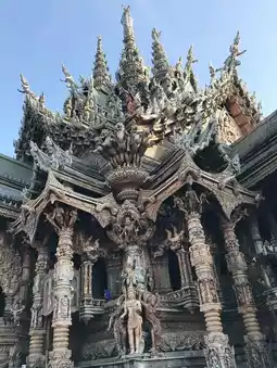 A wooden structure built without nails. Decorated with hand-carved carvings illustrating ancient worldviews and Eastern philosophy, we see scenes from Thai, Indian, Khmer, and Chinese cultures. 🤎