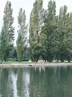 The wooden walking path surrounding the large lake, the calm lake, the wide lawn