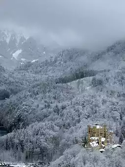 Hohenschwangau: Yellow castle below—Ludwig’s boyhood prison. Contrast his mother’s realism vs. his delusions.