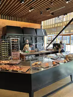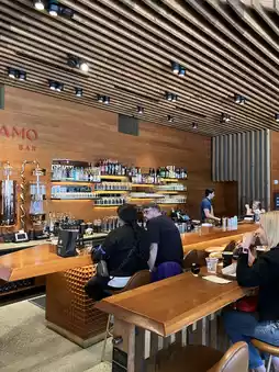 The entire store feels like a tourist attraction. It offers a variety of experiences including coffee, bakery items, and cocktails, all laid out like a course.