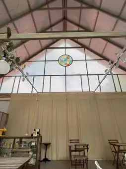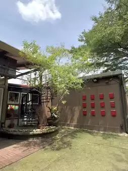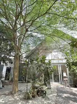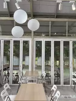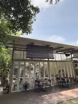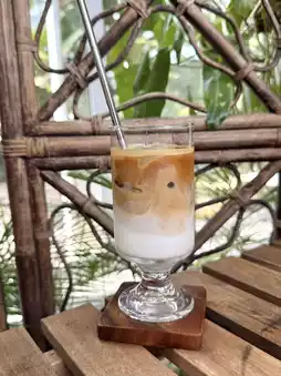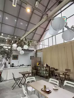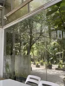 The interior is flooded with natural light, thanks to the all-glass architecture, while potted plants, old-school tiles, and vintage furniture bring warmth and charm. You can choose to sit indoors under soft ceiling fans or step outside into their romantic garden seating, where vines, twinkling lights, and leafy overgrowth wrap you in calm.