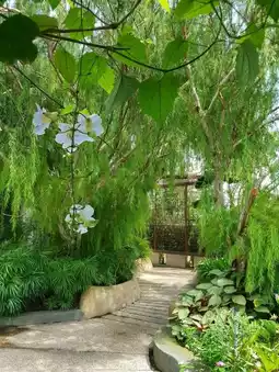 The garden's serene atmosphere is enhanced by winding pathways, lush bushes and small ponds providing .