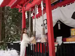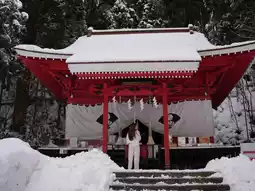 Located on the lakeside north of Lake Tazawa, the Torii gate is facing the direction of Lake Tazawa, which is very beautiful. The shrine's name, Gozaishi, comes from the fact that in 1650, Yoshitaka Satake, the lord of Akita Domain, sat down to rest while touring Lake Tazawa.