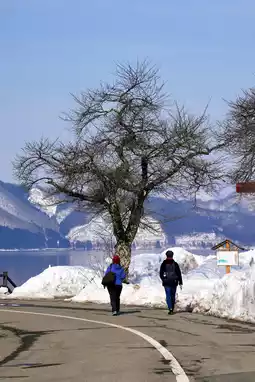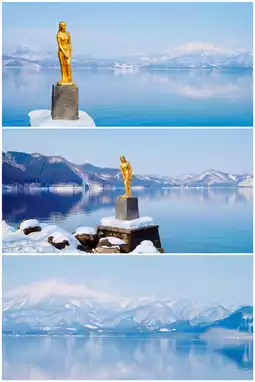 You can take a bus from the JR station to go around the lake, and stop at [Katagiri] for 20 minutes and [Gozanoishi] for 10 minutes, where you can visit the Tatsuko statue and the lakeside torii of Gozanoishi Shrine.