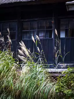 At the entrance, a black wooden sign painted with Japanese calligraphy gradually appears. The thick thatched roof is beginning to sprout green moss, but everything remains strong and peaceful, as if time had never passed.
