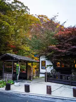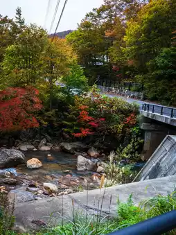 The car left Tsurunoyu's small parking lot and headed up the mountain. The narrow, winding road weaved through a forest of autumn leaves, thick with woven cloth. Oak trees leaned against the steep slopes, the water still cascading along the sides. Silent but not silent, it was not without sound.