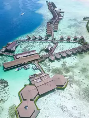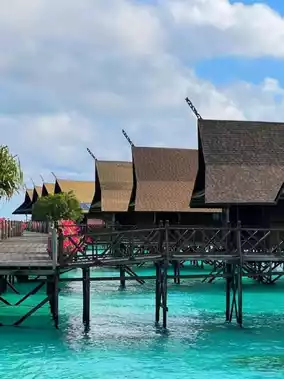 Wooden chalets floating above turquoise waters