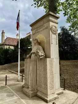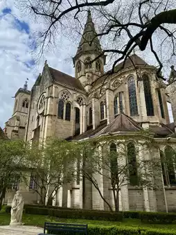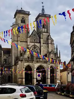 The Gothic twin-towered church Collegiale Notre Dame; inside, there is a stained glass window (1927) and a plaque commemorating American soldiers who died in France during World War I.