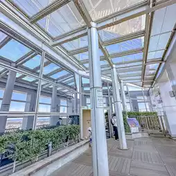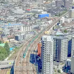 There are two terraces on either side of the building, and on one side you can see the Tohoku Shinkansen line running north and south and the Shinkansen train above it, and on the other side you can see the beautiful cityscape and the peaks of Tohoku.