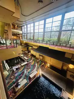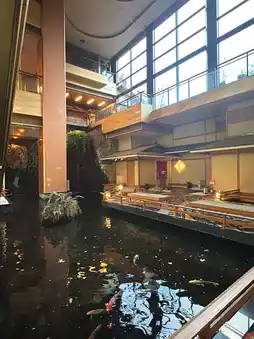The open-air atrium from B1 to 2F and the pond with koi carp swimming in it have a wonderful atmosphere.