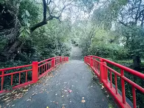 * The stone steps leading up the path are lined with moss-covered stone steps and trees, offering beautiful views throughout the seasons, especially in spring when the cherry blossoms and fresh greenery bloom.