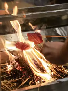 The Irori Grilled Jumbo Tiger Prawn ($10) is simplicity perfected: slow-grilled over charcoal and finished with lemon and sea salt, while the Tuna Wara Tataki ($32) stuns with its straw-seared smokiness, bright ponzu, and crispy garlic chips.