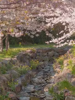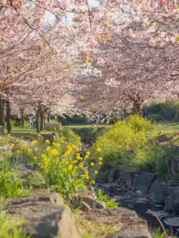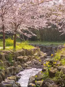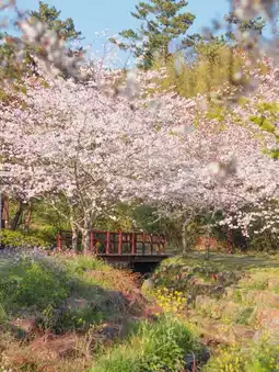 Located near Seogwipo, Yerae Ecological Park is a park created along a stream called Daewangsucheon. If you park your car in the parking lot and walk over the slope, you will see yellow rapeseed flowers swaying in the wind on both sides of the stream and cherry blossoms in full bloom above your head. When I visited, the cherry blossoms were in full bloom and falling, so when the wind blew, a shower of flowers would come up, and when the sunlight shone through, the water sparkled between the petals, making it a dreamlike place.