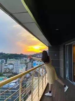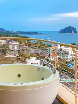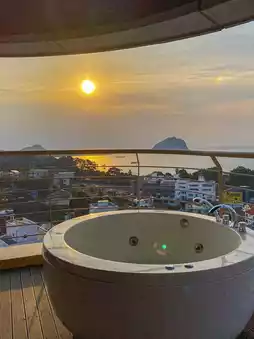It's a 4-star hotel with an outdoor private whirlpool, so you can enjoy the sunset + night view while taking a bath!