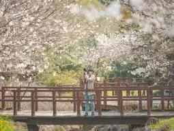 Yerae Ecological Park, located in Seogwipo, Jeju, is a popular spot for cherry blossoms in full bloom in the spring, creating a beautiful cherry blossom path. Park and walk for about 5 minutes to reach a wooden bridge, perfect for taking photos of your life :)