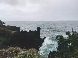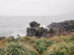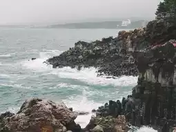 Daepo Coast Columnar Joint Belt is a special coastal landform attraction, where you can see black stone pillars piled up on the coast. It was formed by the eruption of Halla Mountain, where lava flowed into the sea and cooled. You can see many square and hexagonal stone pillars, and the waves below are crashing on the shore, which is quite spectacular. It happened to be rainy when I visited, and the coast was even more shocking.