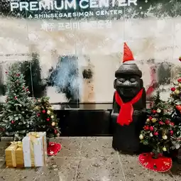 I went to the shopping street inside Shinhwa World Resort. A Christmas tree greeted me from the entrance, and I had to check my temperature and do QR authentication in front of the escalator to get a sticker that said I checked before going down. There were many brands gathered together, so it was good for shopping, and I especially enjoyed shopping because there were swim brands like Billabong and Roxy. There were also Kakao Friends, so I also shopped for Jeju-specific souvenirs.