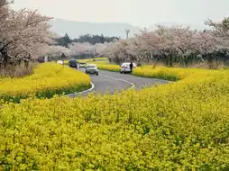 Jeju Noksan Road, known as the "most beautiful road in spring", is one of the 100 most beautiful roads in South Korea. Every spring, the cherry blossoms and rape flowers here bloom at the same time, forming a dreamy scene of pink and gold.