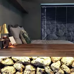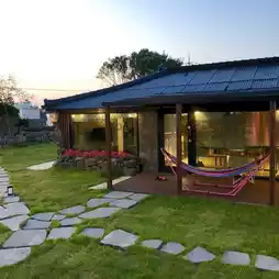 I think this is the accommodation that properly shows the style of Jeju Island with a space harmoniously decorated with trees, stones, and plants.