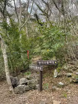 → From the "Hallasan Dulle-gil," turn left to find a lined, uphill cedar forest path. Turn right to find a flat cedar forest path.