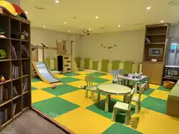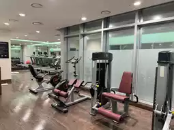 The gym equipment includes a treadmill, cycle, leg curl, leg extension,