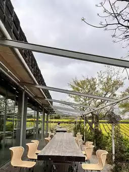 A healing space in the middle of nature with a wide green tea field. A modern building and a warm tea house are in harmony.