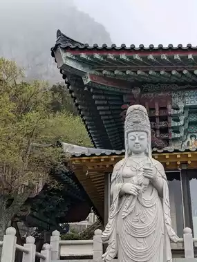 Walking about twelve minutes down the street, you will come across the Sanbangsan Temple, a Buddhist temple featuring intricate woodwork and a large collection of statues of disciples. There's also a hike you may choose to embark on for a small fee, either 1000kw or 2000kw, which takes you to see the Sanbanggulsa Grotto, a cave that holds a religious statue.