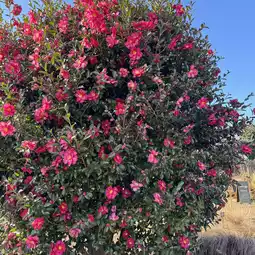 and there are trees lined up along the road with camellia flowers in full bloom.