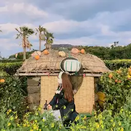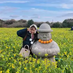 Jeju Island's iconic tangerine and Dolhareubang (stone grandfather) motifs create a well-designed photo zone, making it a great place to visit when you're looking for canola flowers.