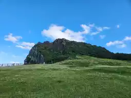 The walk to the top isn’t difficult — around 20 minutes up well-maintained steps — but it’s steep enough to get your heart pumping. Along the way, you get sweeping views of Jeju’s coastline, emerald fields, and the nearby village below. The crater itself is vast, quiet, and green — a caldera carved by time, now peaceful and still.