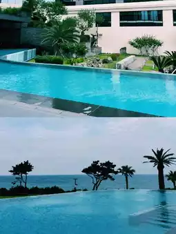 The outdoor infinity pool is designed to seamlessly connect with the Jeju sea.