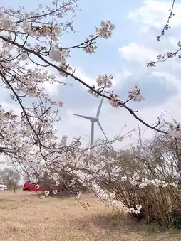 I took photos of windmills, rapeseed flowers and cherry blossoms at the same time.