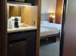 The minibar includes snacks, fruit drinks, and ๐ฅ nuts, while the welcome fruit is ๐ tangerines.